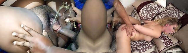 cuckold wife urinating in the face and on the jaws of the cuckold after getting creampied by another man in front of him